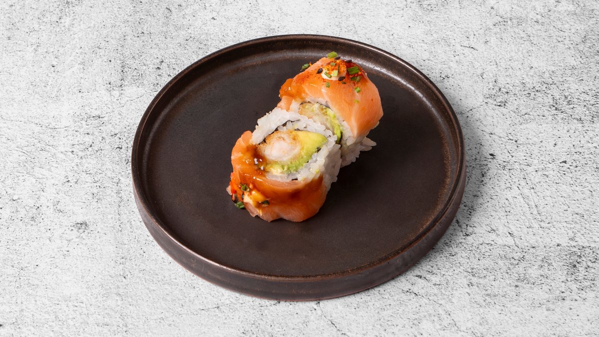 Serveres med flamberet laks, avocado, agurk, masago, teriyaki og purløg.
