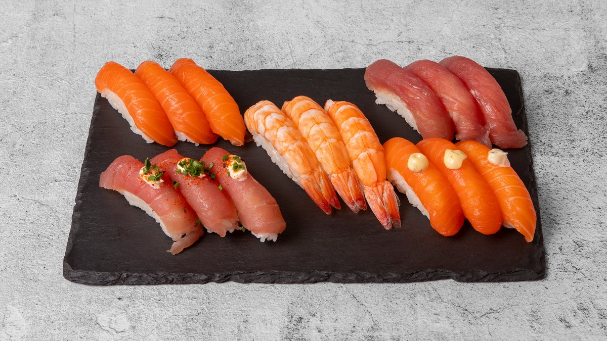 Nigiri: 3x Laks 3x Tun 3x Reje 3x Laks Hvidløgsmayo 3x Spicy Tun