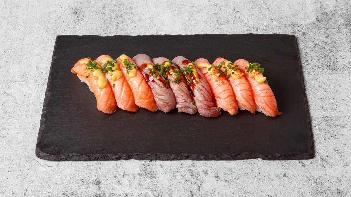 Flamberet Nigiri: 3x Laks 3x Laks Spicy 3x Tun Teriyaki