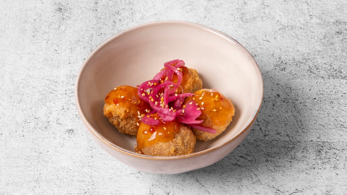 Dybstegte gyoza med kylling, chilimayo, teriyaki og forårsløg.
