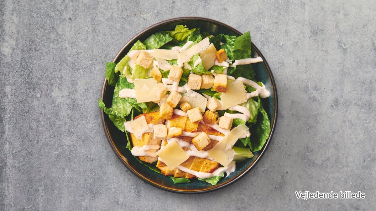 Sprød friturestegt kylling på frisk salat vendt i hjemmelavet Cæsardressing. Topped med parmesan og sprøde croutoner