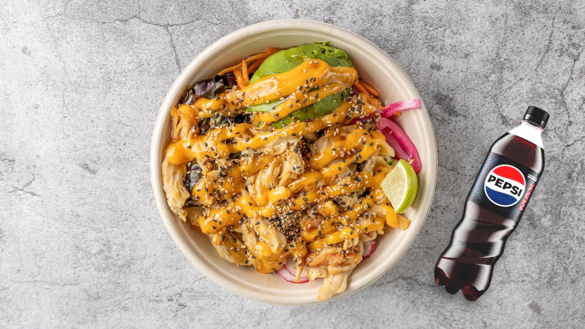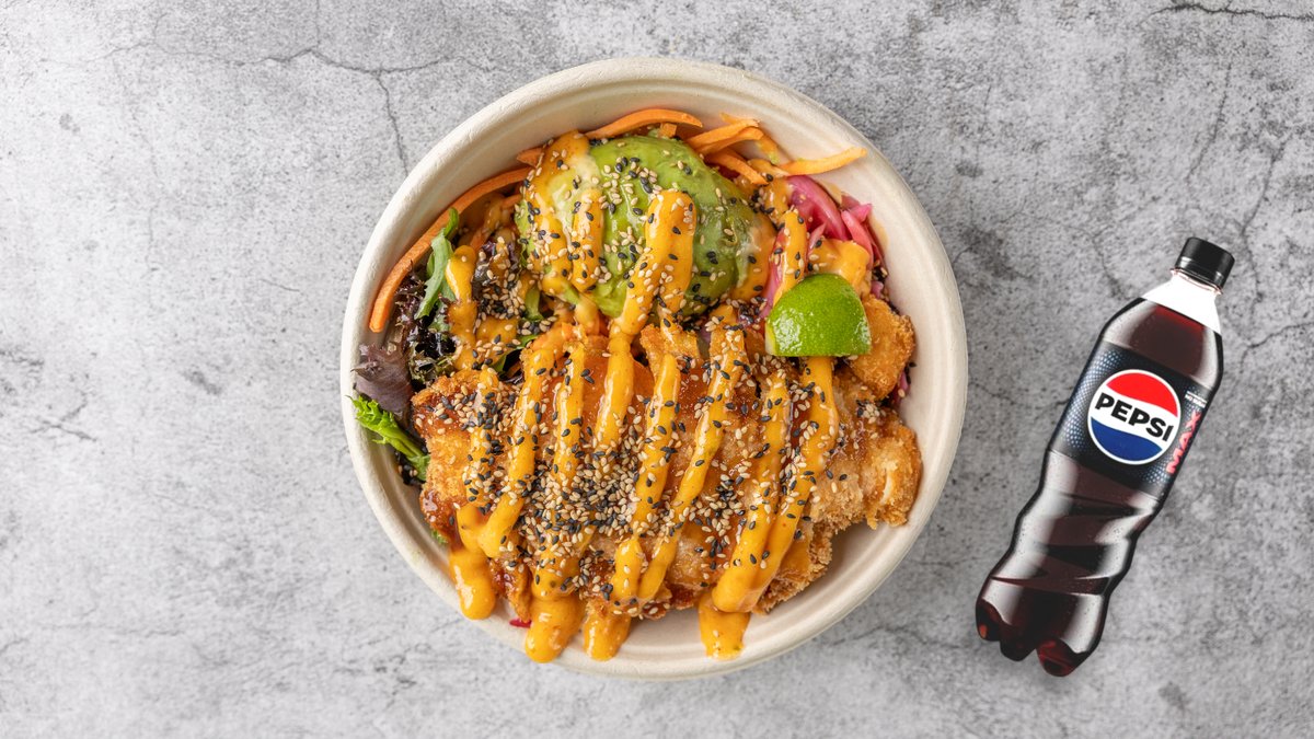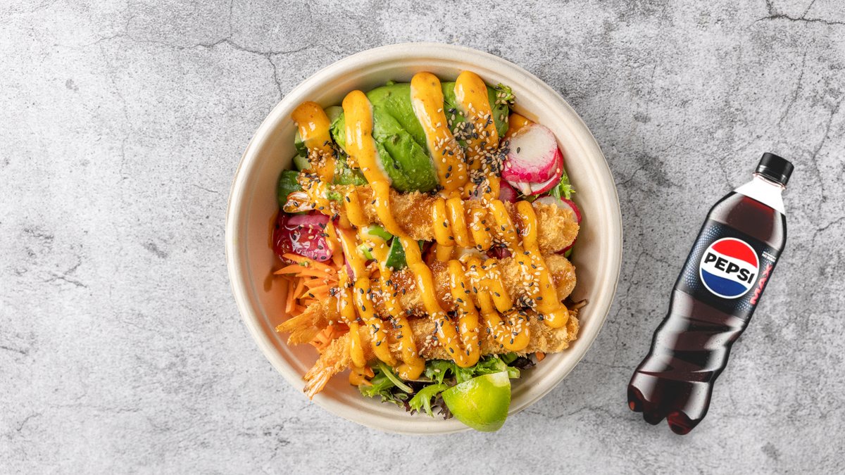 Valgfri poké bowl, en valgfri onigiri og en valgfri sodavand.