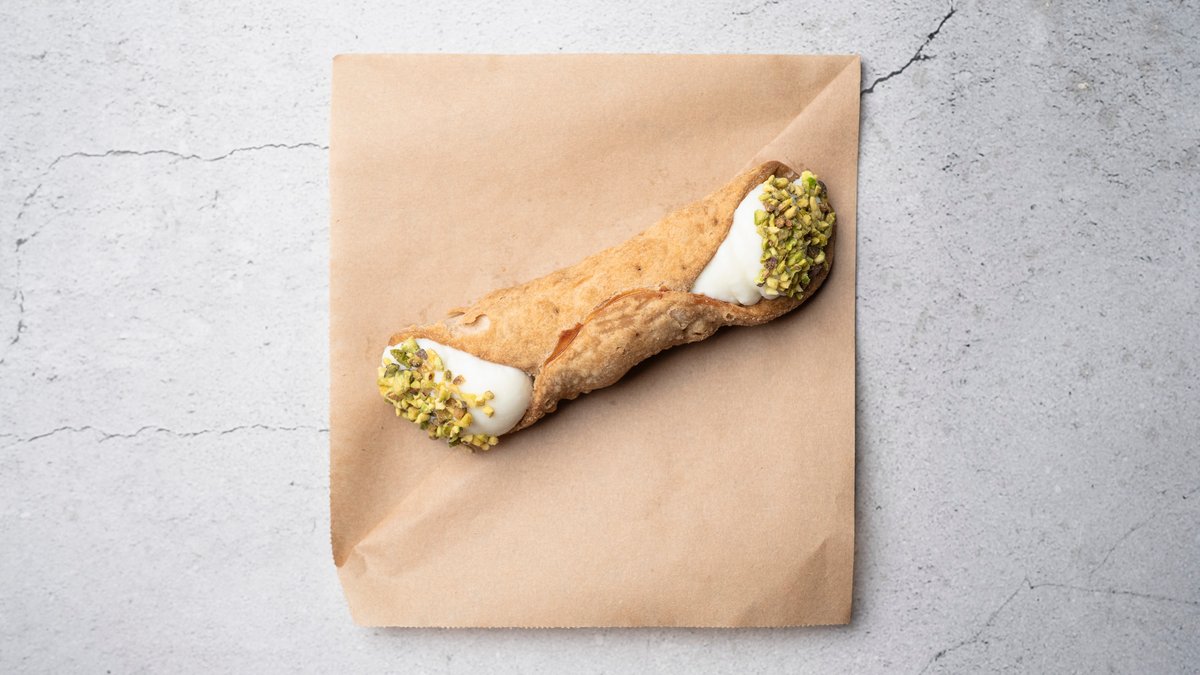 Friteret vaffelrulle med fyld af ricotta, vanilje og citron.