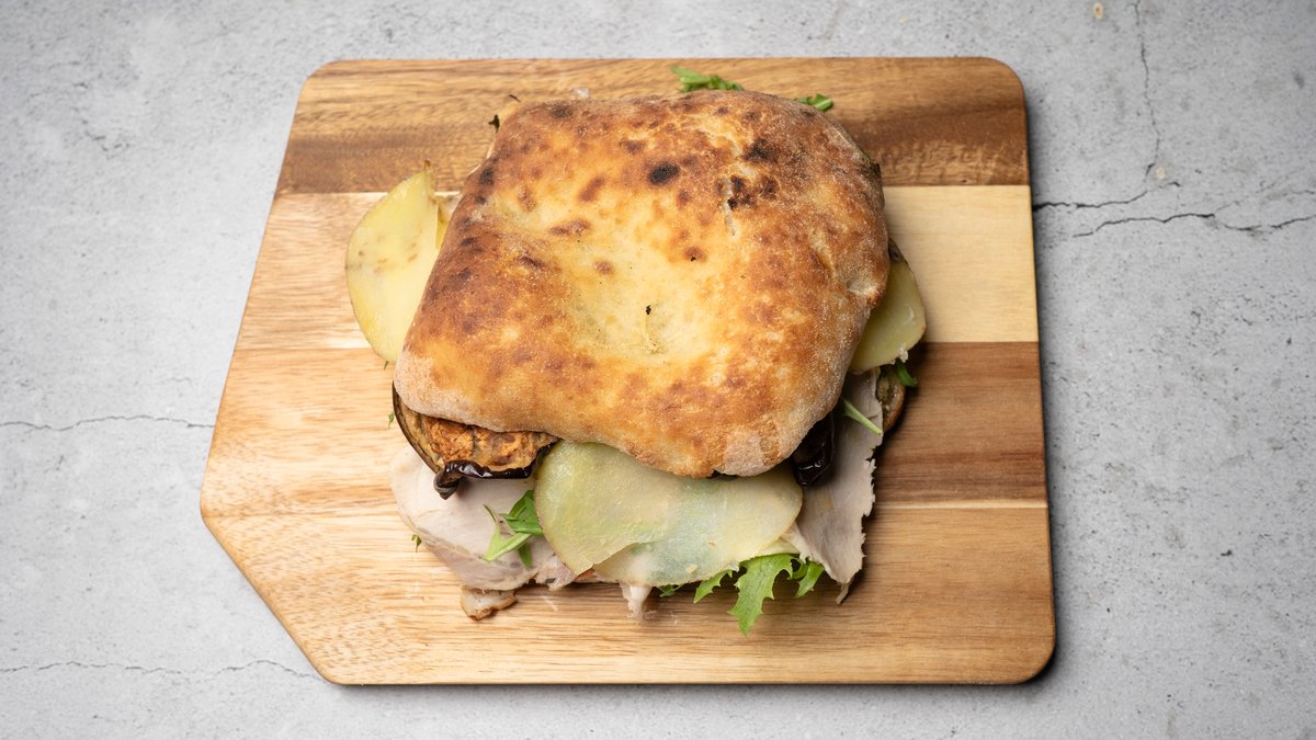 Hjemmelavet pizzabrød fyld af italiensk pattegris, kartofler, aubergine og provola flakes.