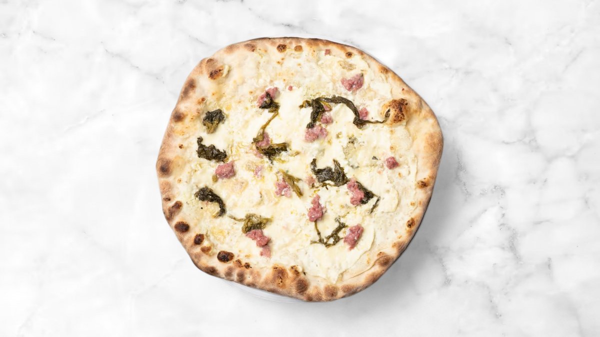Mozzarella, salsiccia, gorgonzola og friarielli (broccoli blomster)
