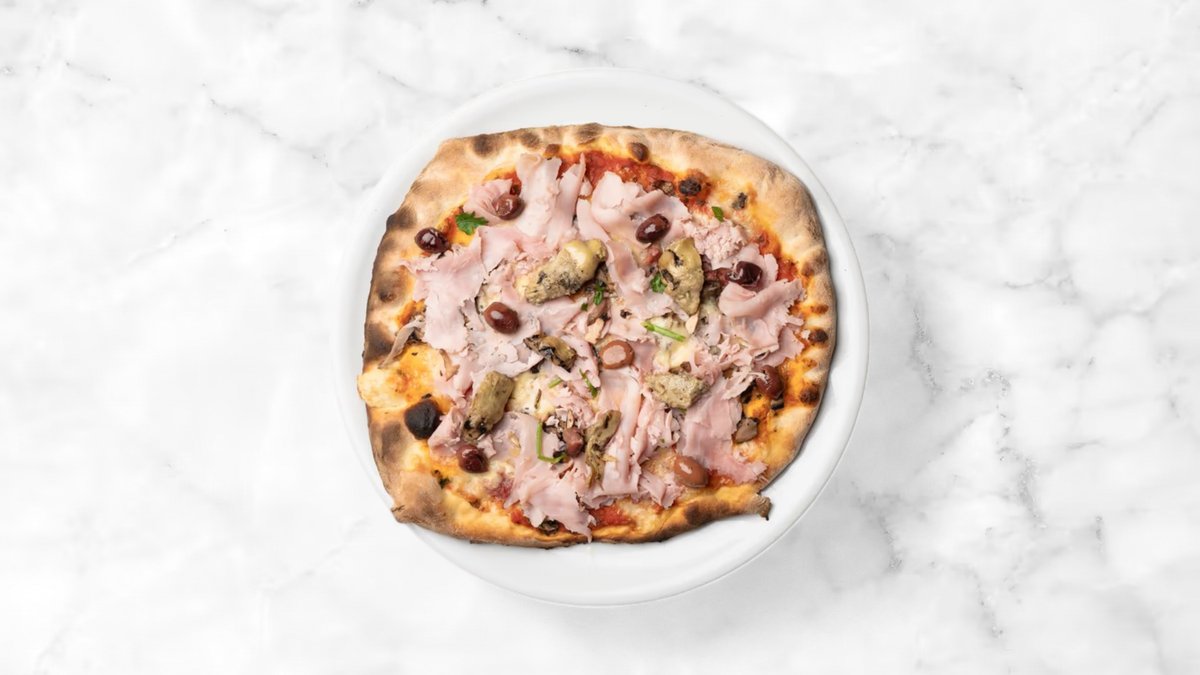 Tomatsauce, mozzarella, skinke, grillede artiskokker og oliven.