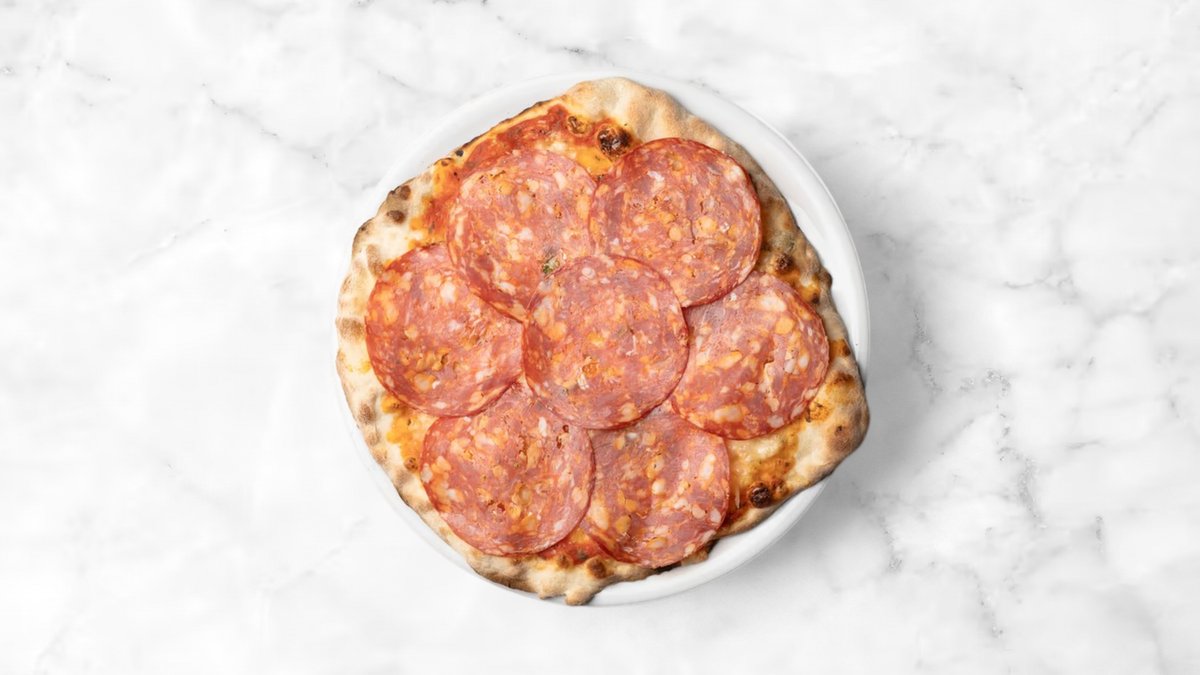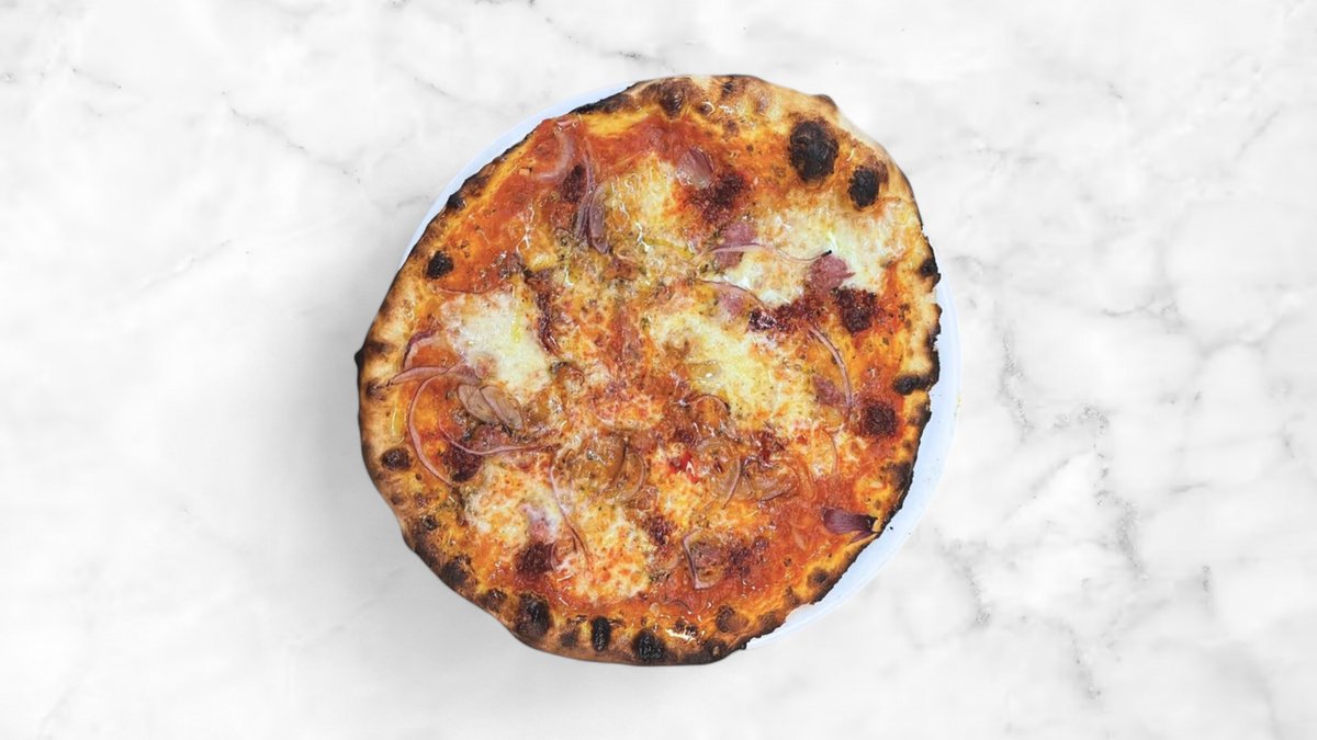 Tomatsauce, mozzarella, nduja, salsiccia og rødløg.