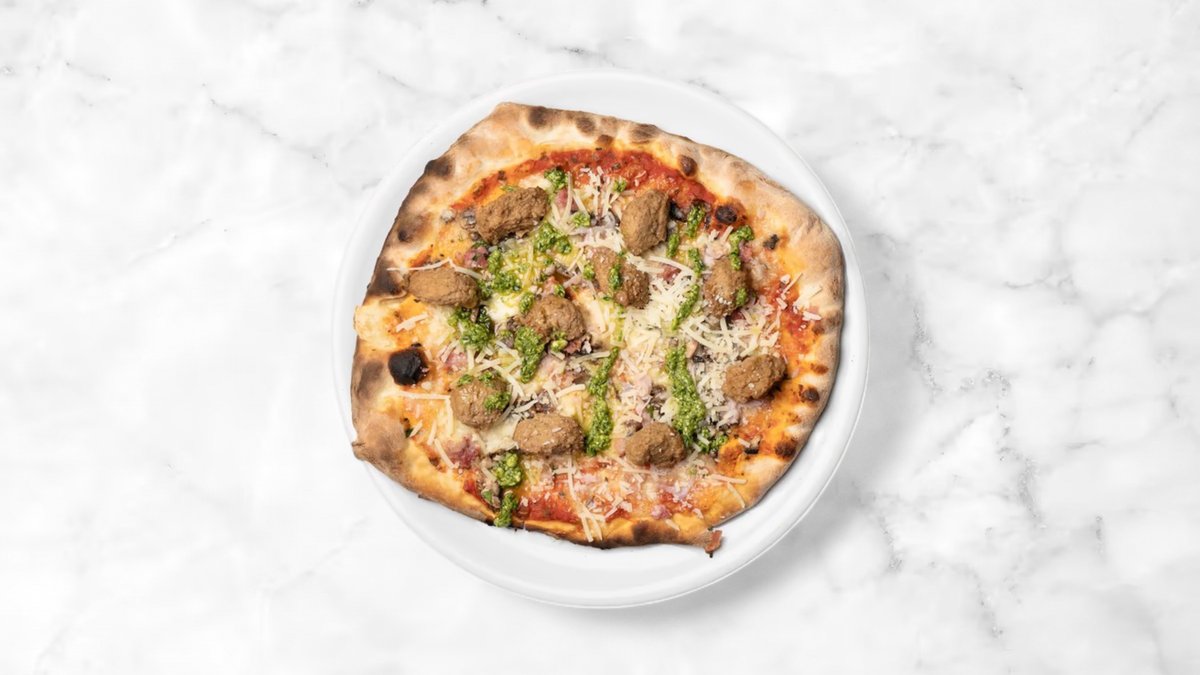 Tomatsauce, mozzarella, oksekødboller, grana flakes og pesto.