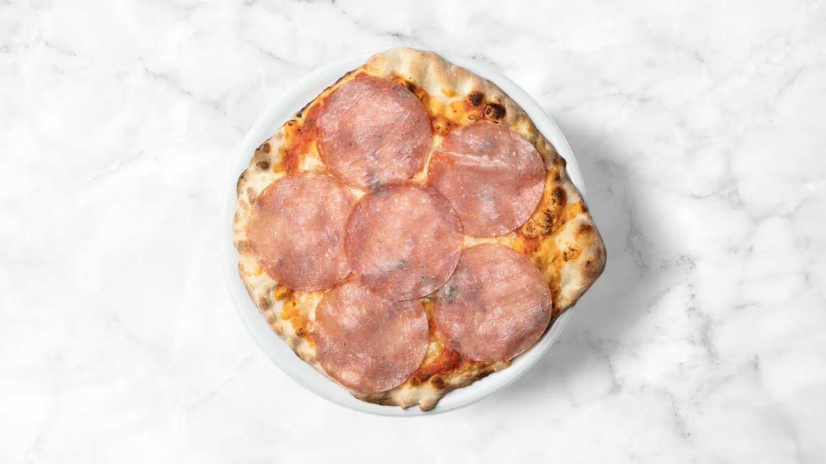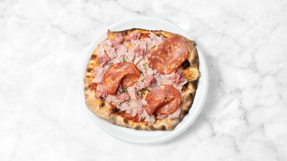 Tomatsauce, mozzarella, salsiccia, kogt skinke og salame.