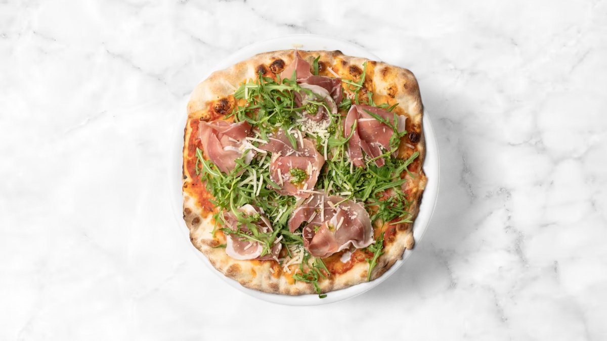Tomatsauce, mozzarella, parmaskinke, rucola, grana ost, cherrytomater og pesto.