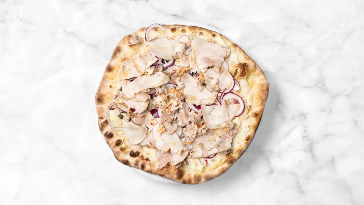 Porchetta di ariccia, provola ost, mozzarella, sort peber, mozzarella og rødløg.