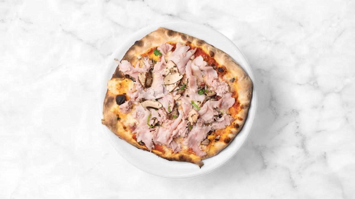 Tomatsauce, mozzarella, italiensk kogt skinke og Portobello frisk svampe.