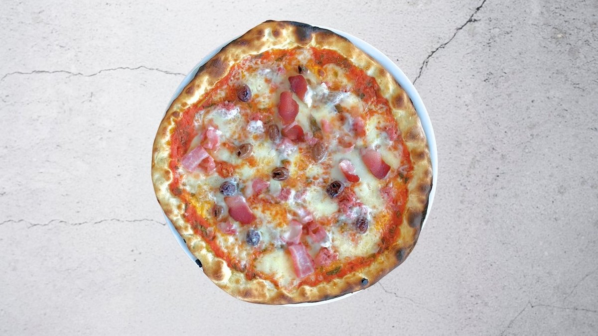 Tomatsovs, mozzarella, Bacon, Saldiccia og Provola ost, oliven.