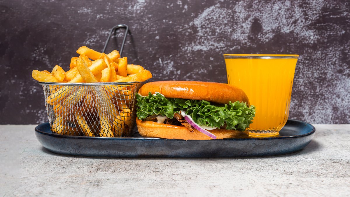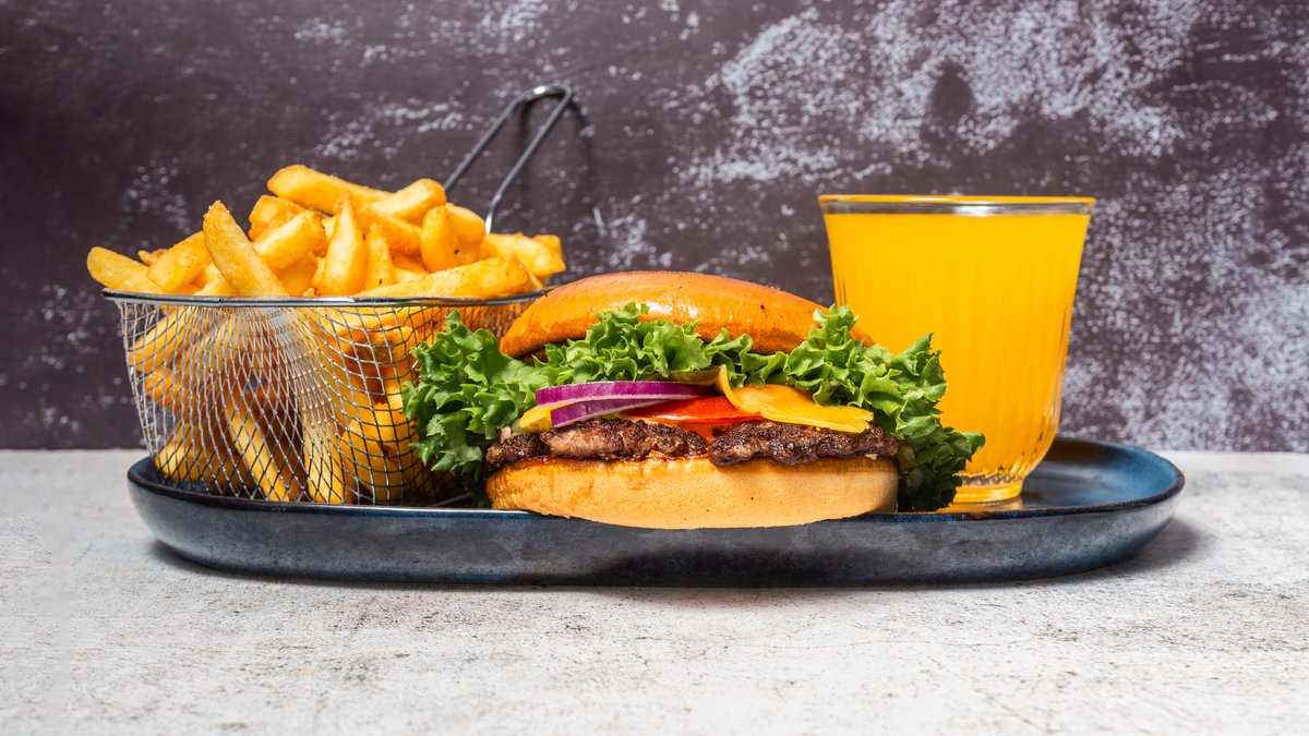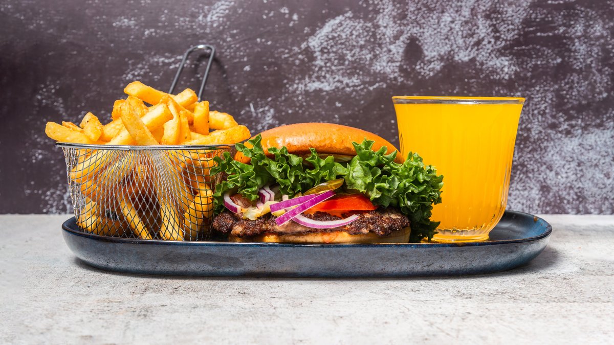 Serveres med pommes frites og en valgfri 0,33 l sodavand.
