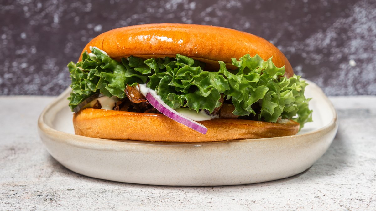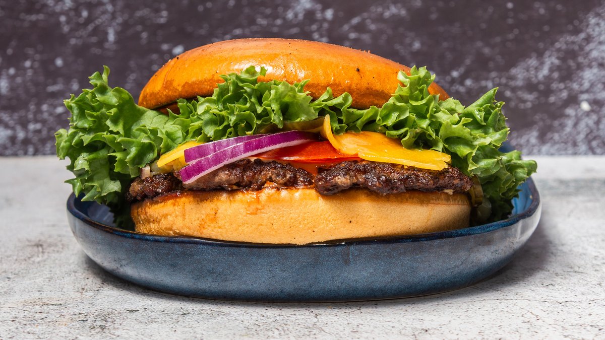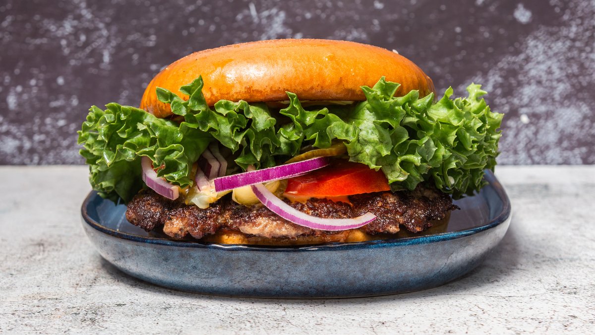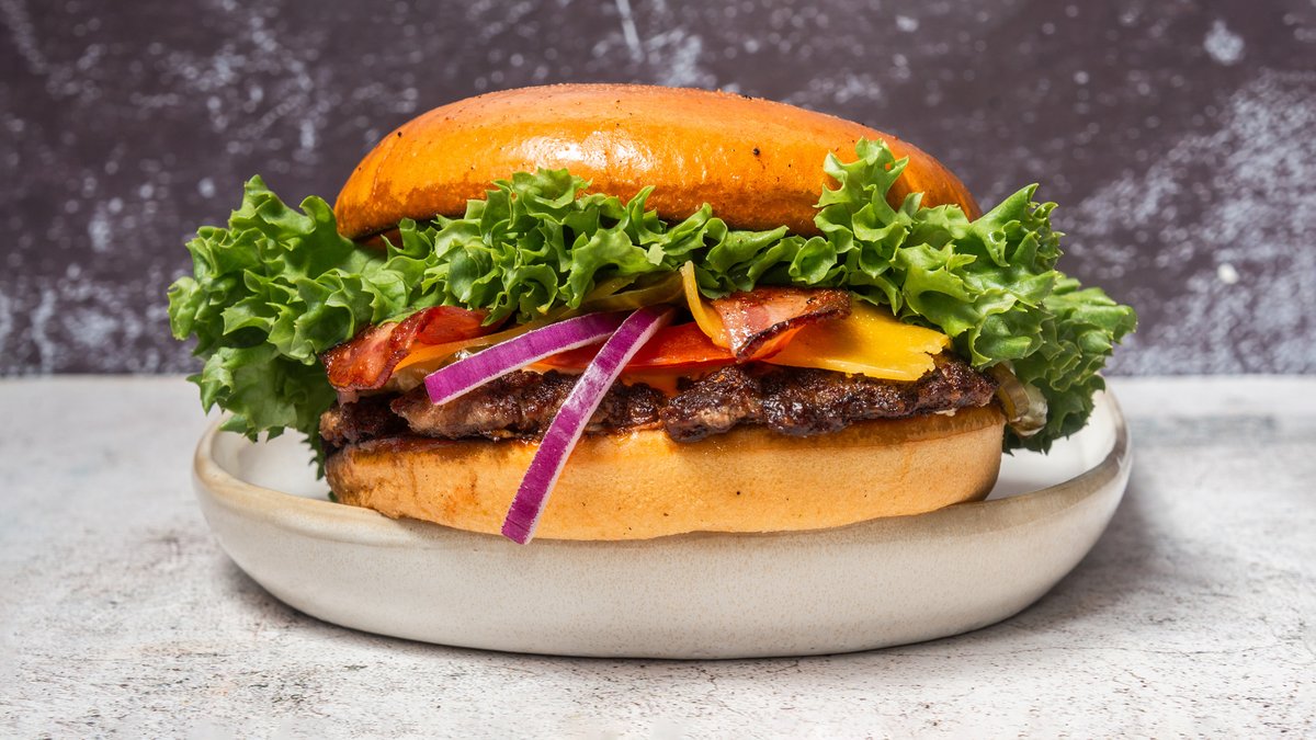 Bøf af okse i briochebolle med bacon, ost, salat, tomat, syltede agurker, løg og dressing.