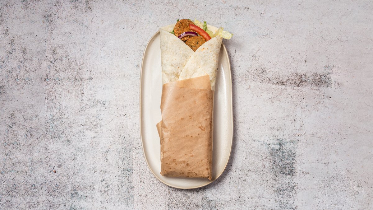 Fladbrød med fyld af valgfri protein, salat, agurk, tomat, løg og dressing.