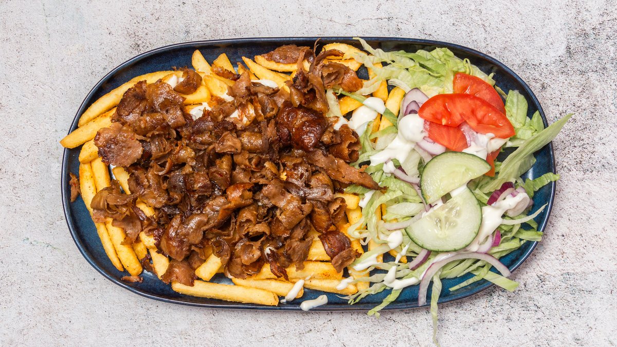 Kebab i briochebolle med salat, tomat, syltede agurker, løg og dressing.