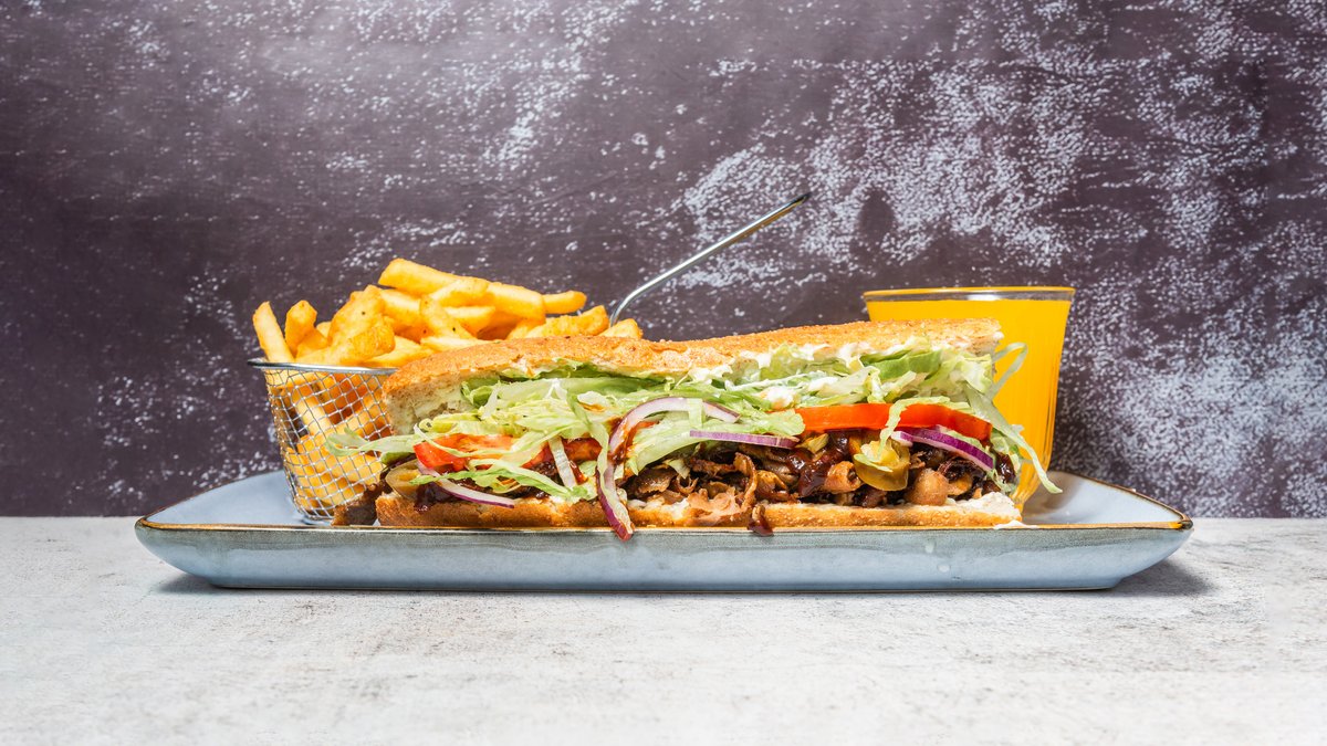 Varm sandwich med sandwich med fyld af kylling, kebab, rødløg, jalapeños og barbecue.
