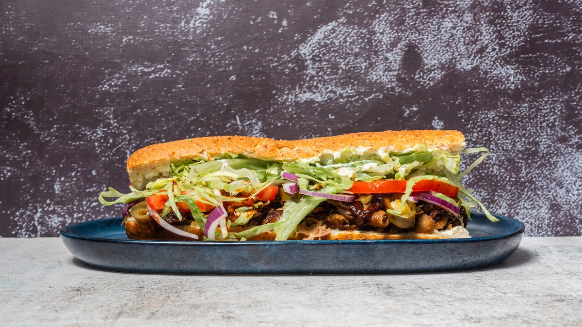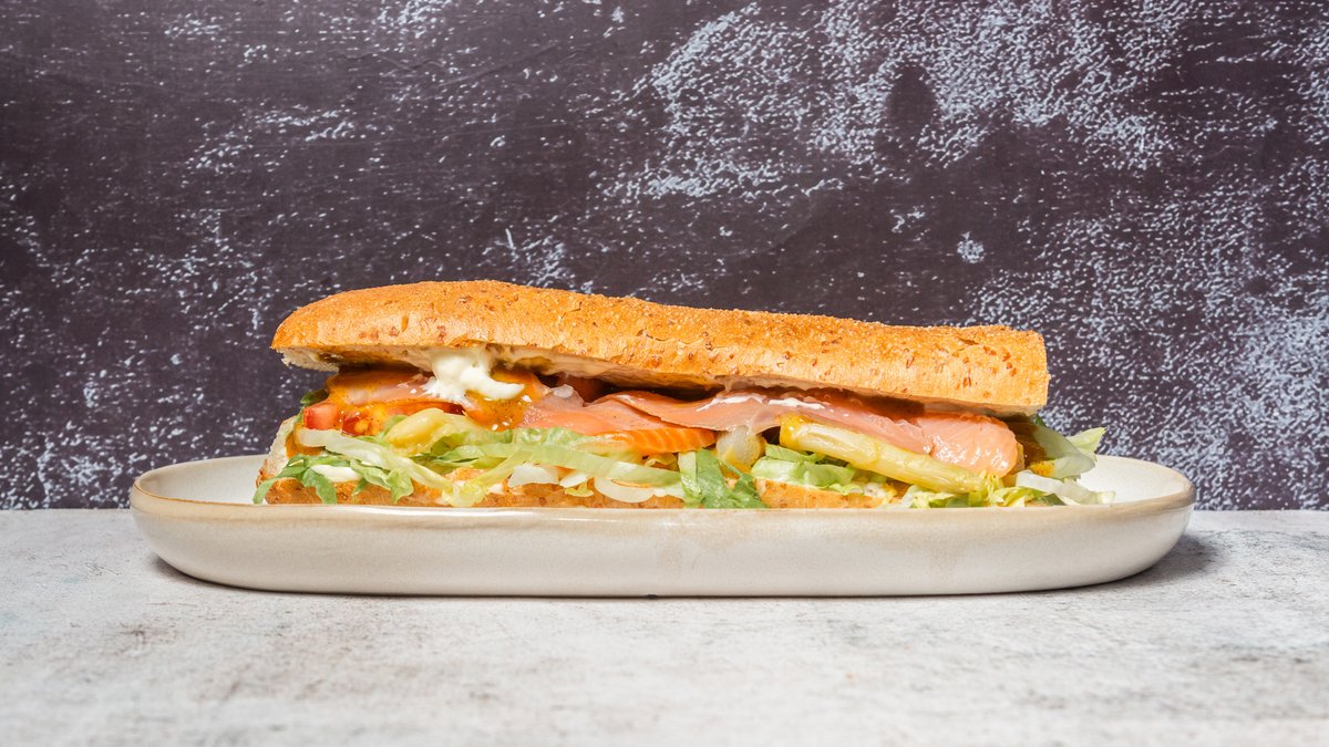 Varm sandwich med fyld af salat, tomat, mayonnaise, agurk, paprika, løg og jalapeños.