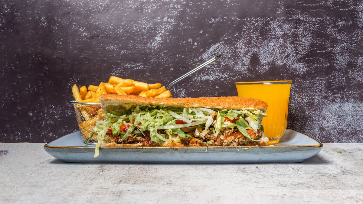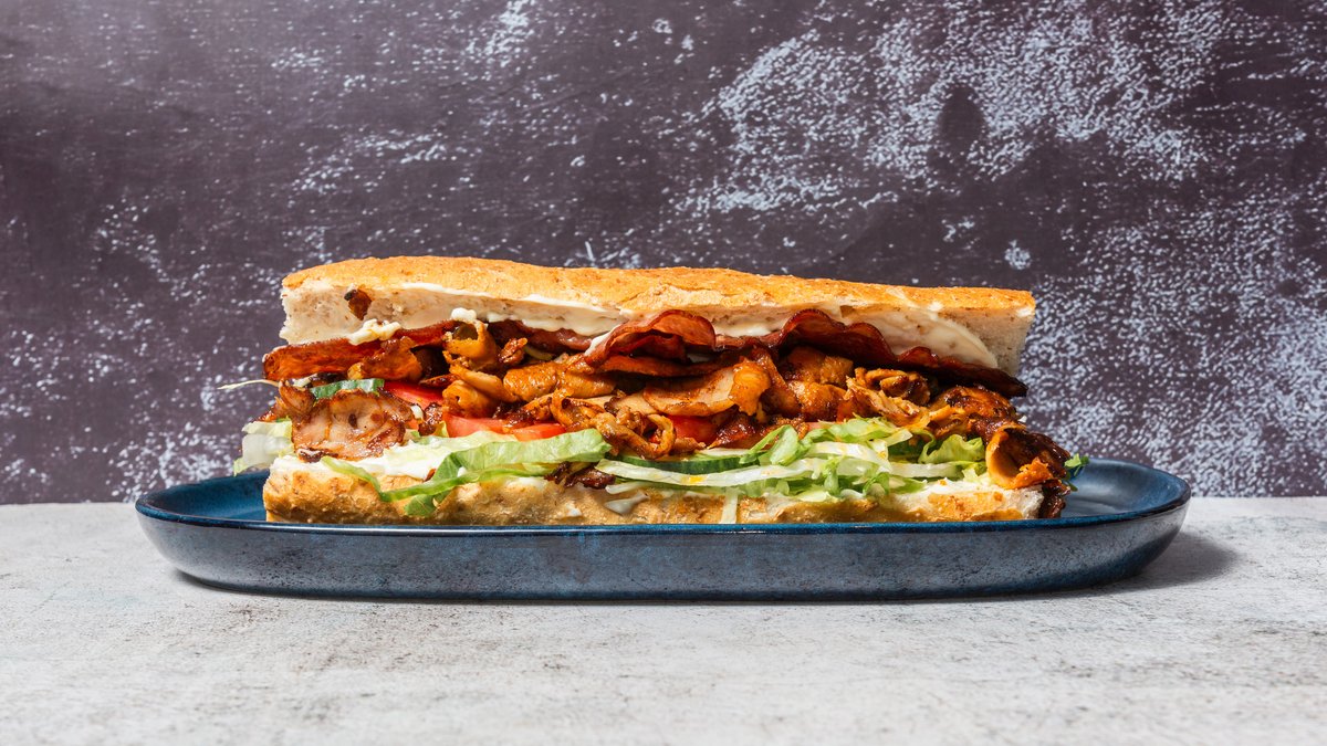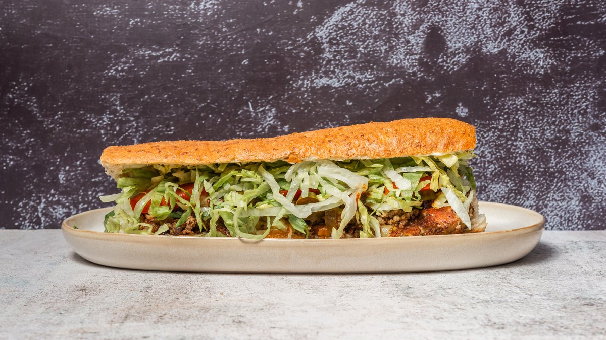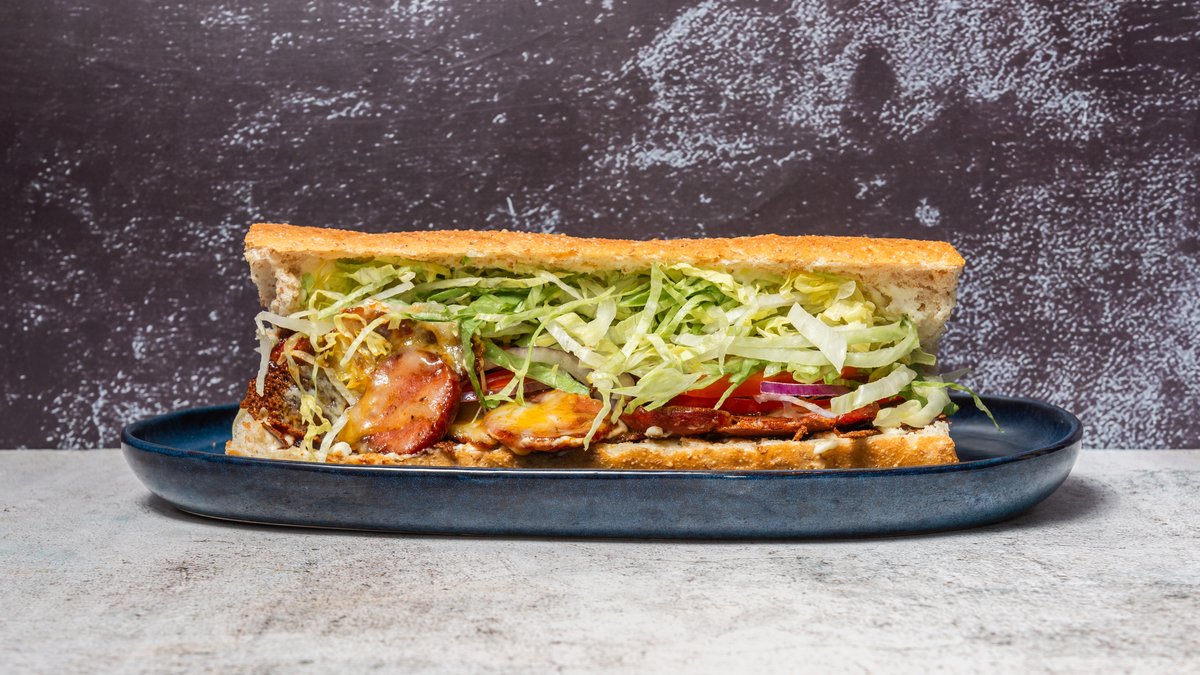 Varm sandwich med fyld af salat, tomat, mayonnaise, ost, løg, jalapeños, paprika og barbecue.