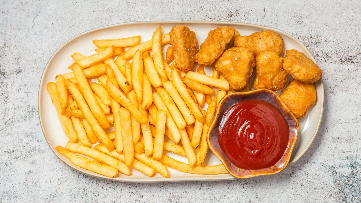 Serveres med pommes frites og valgfri dyppelse.