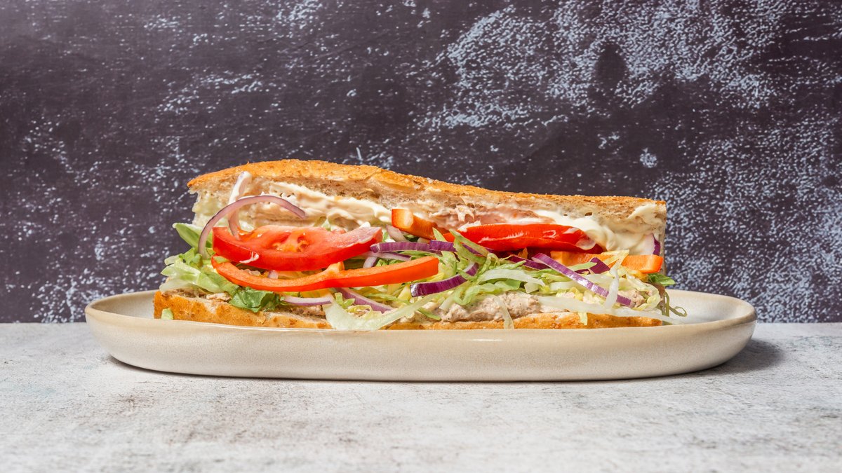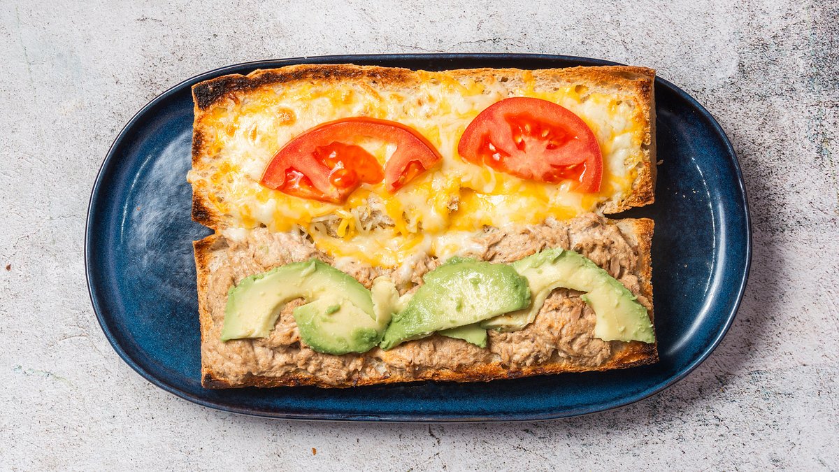 Med fyld af tun, ost, avocado og tomat.