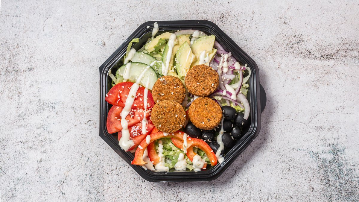 Falafel, avocado, oliven, paprika, sesam, salat, tomat, agurker, løg og dressing.