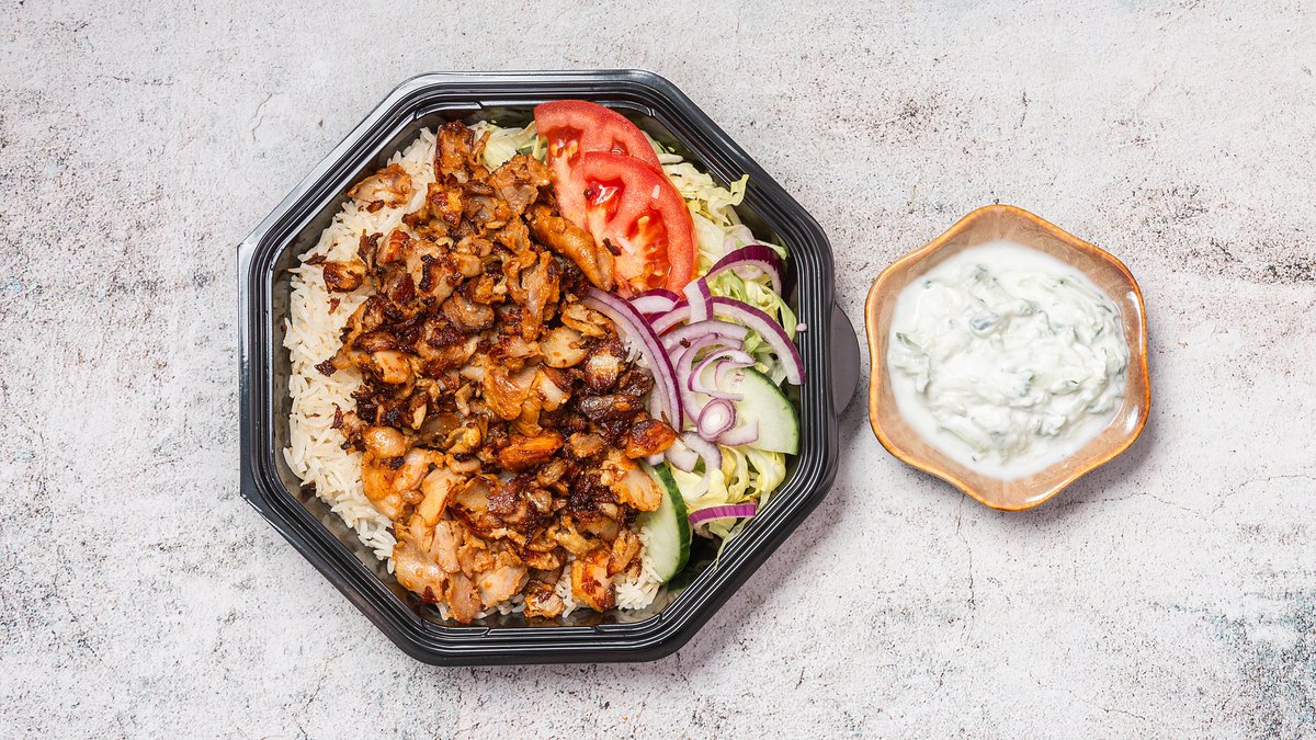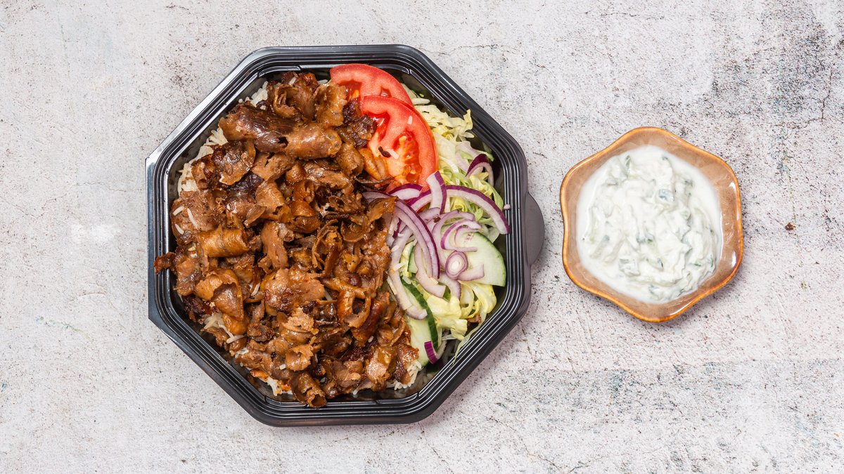 Valgfri protein, ris, tzatziki, rucola, salat, tomat, agurk, rødløg og dressing.