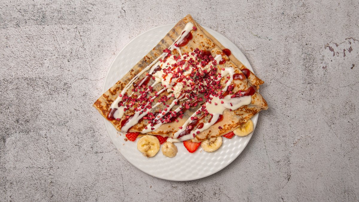 Nyd vores specielle "Triple Dream" crepes - fyldt med Nutella, banan & jordbær, toppet med hvid chokolade & jordbærsauce, krymmel og flødeskum.