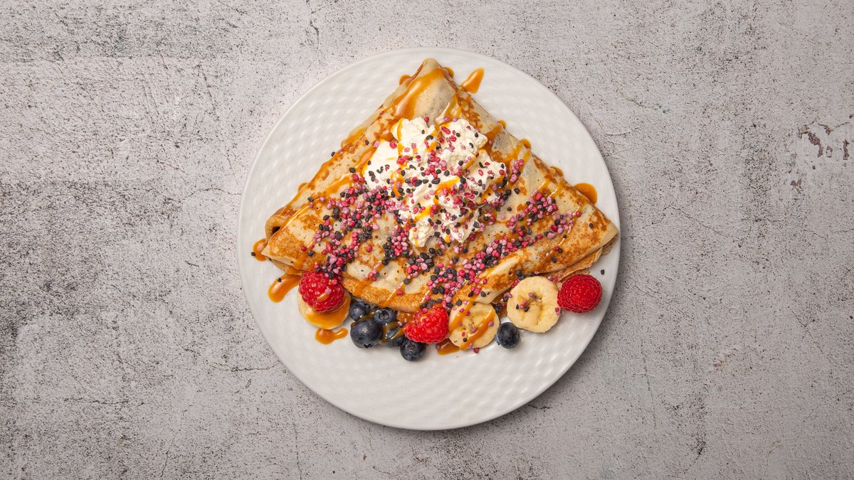 Nyd vores frisklavede crepes, fremstillet af frisk hvedemel, æg og mælk. Perfekt til dine yndlingstoppinger!