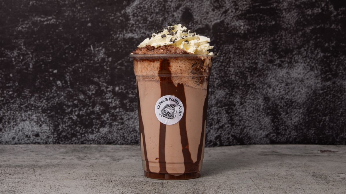 Chokolade iskugle, espresso, chokoladesirup, mælk, chokoladesauce og flødeskum