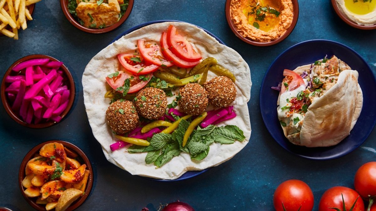Fladbrød med rødkål, agurk, tomat, grøn salat, feta, valgfrit protein og valgfri dressing. Serveres med valgfrit tilbehør og valgfri drikkevare. Vælg selv menustørrelse.
