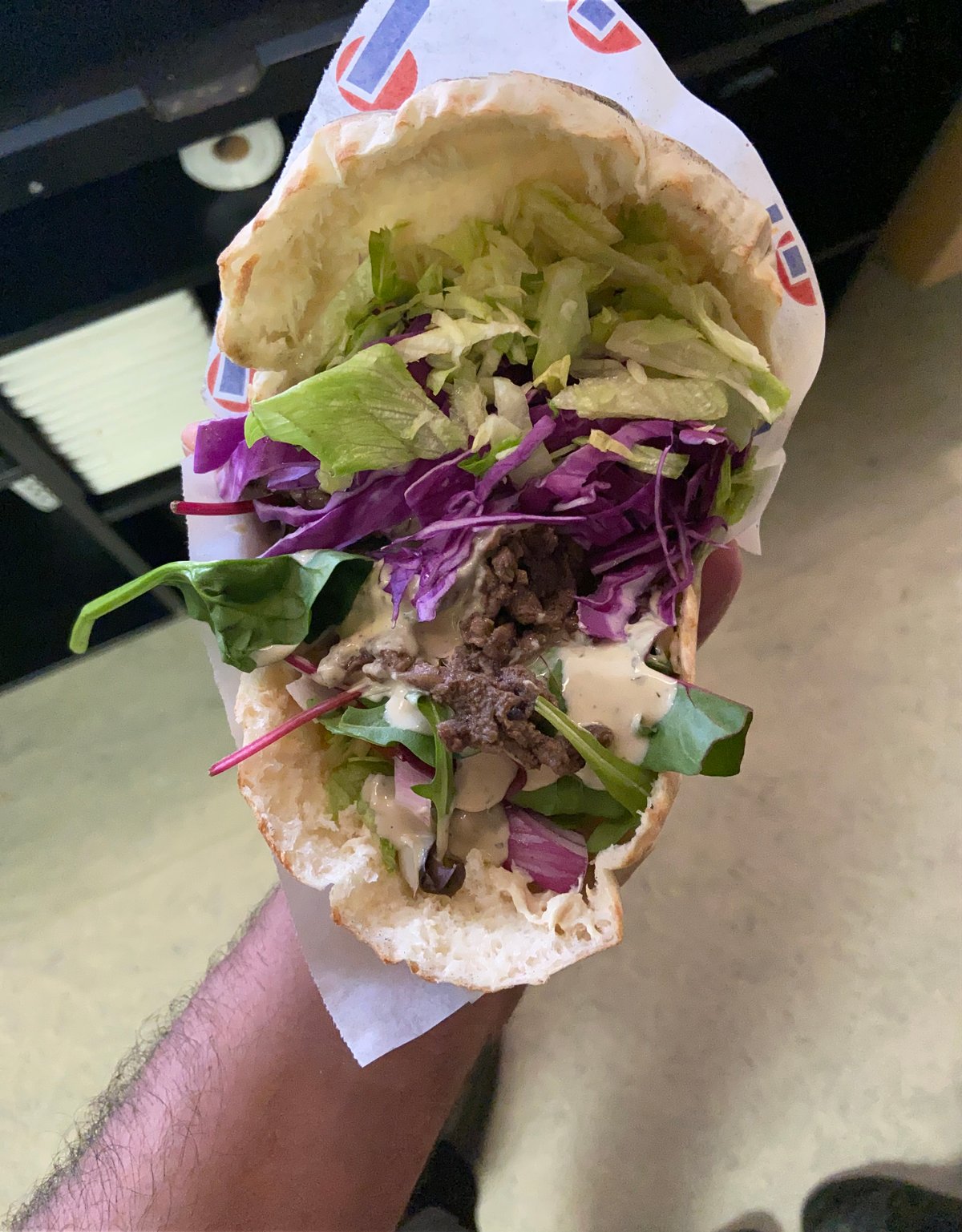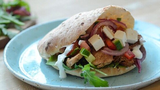 Hjemmelavet pitabrød med rødkål, agurk, tomat, grøn salat, feta, valgfrit protein og valgfri dressing. Serveres med valgfrit tilbehør og valgfri drikkevare. Vælg selv menustørrelse.