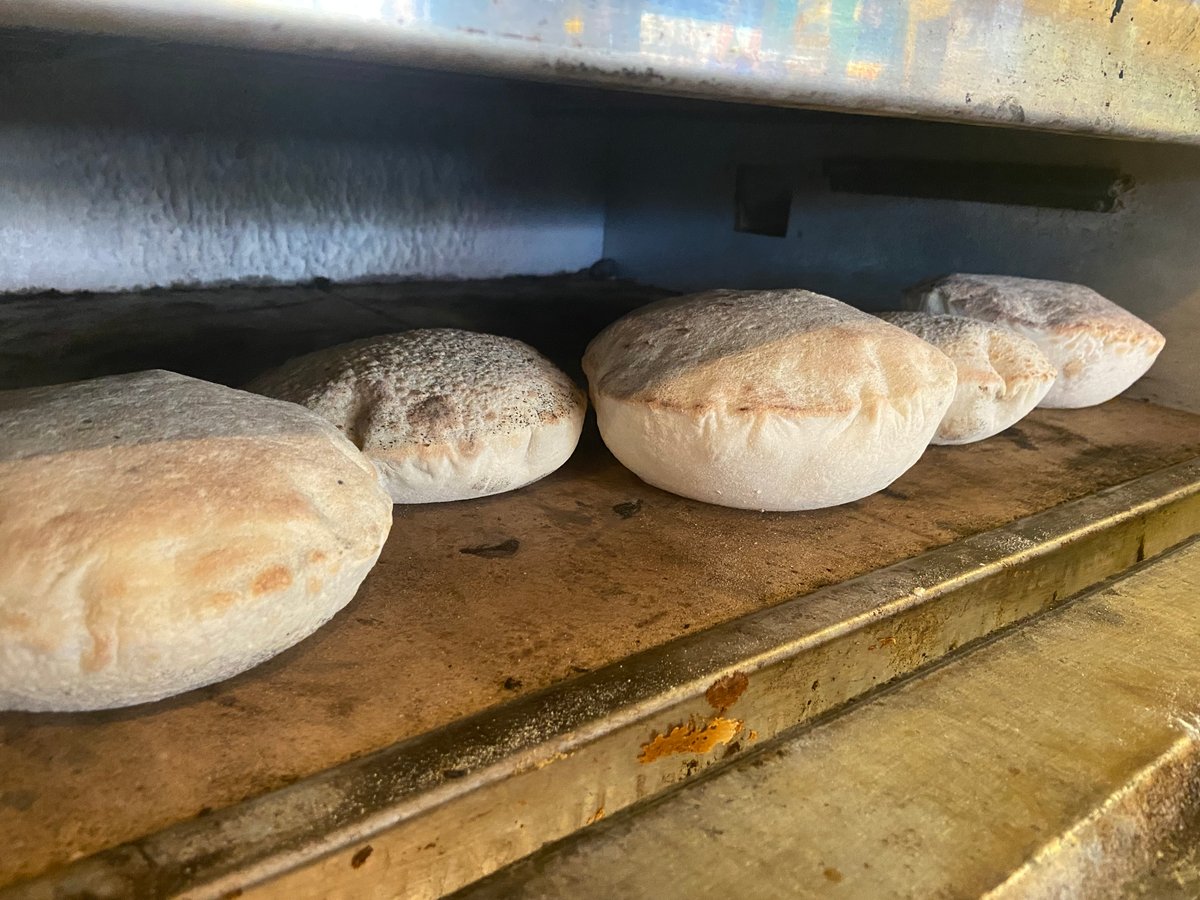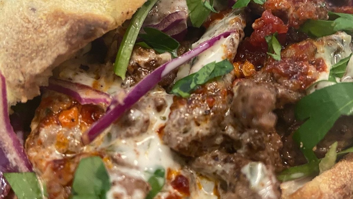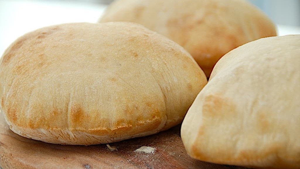 Hjemmelavet pitabrød med mynte, persille, blandet salat, hummus og tahini.