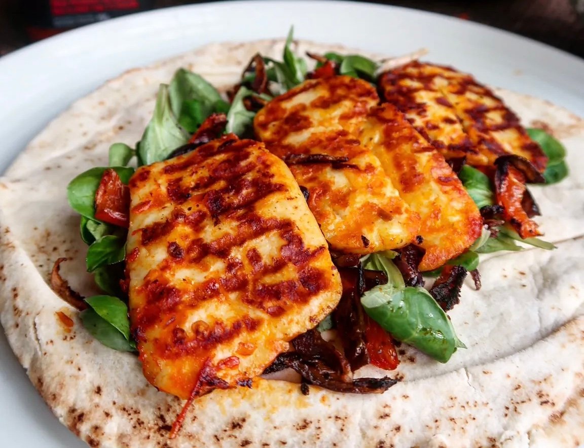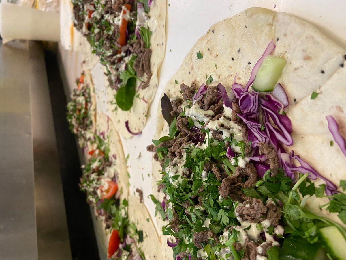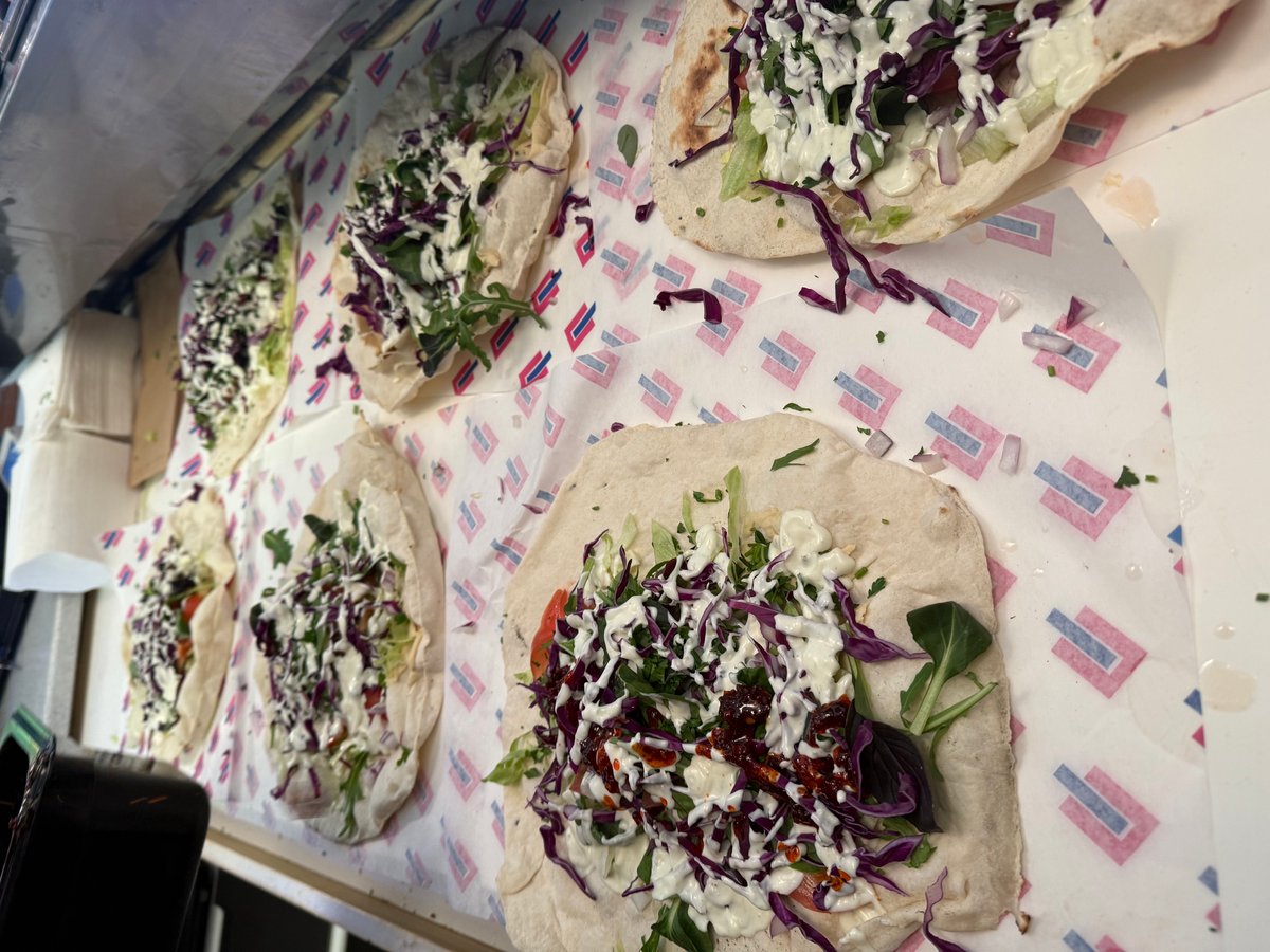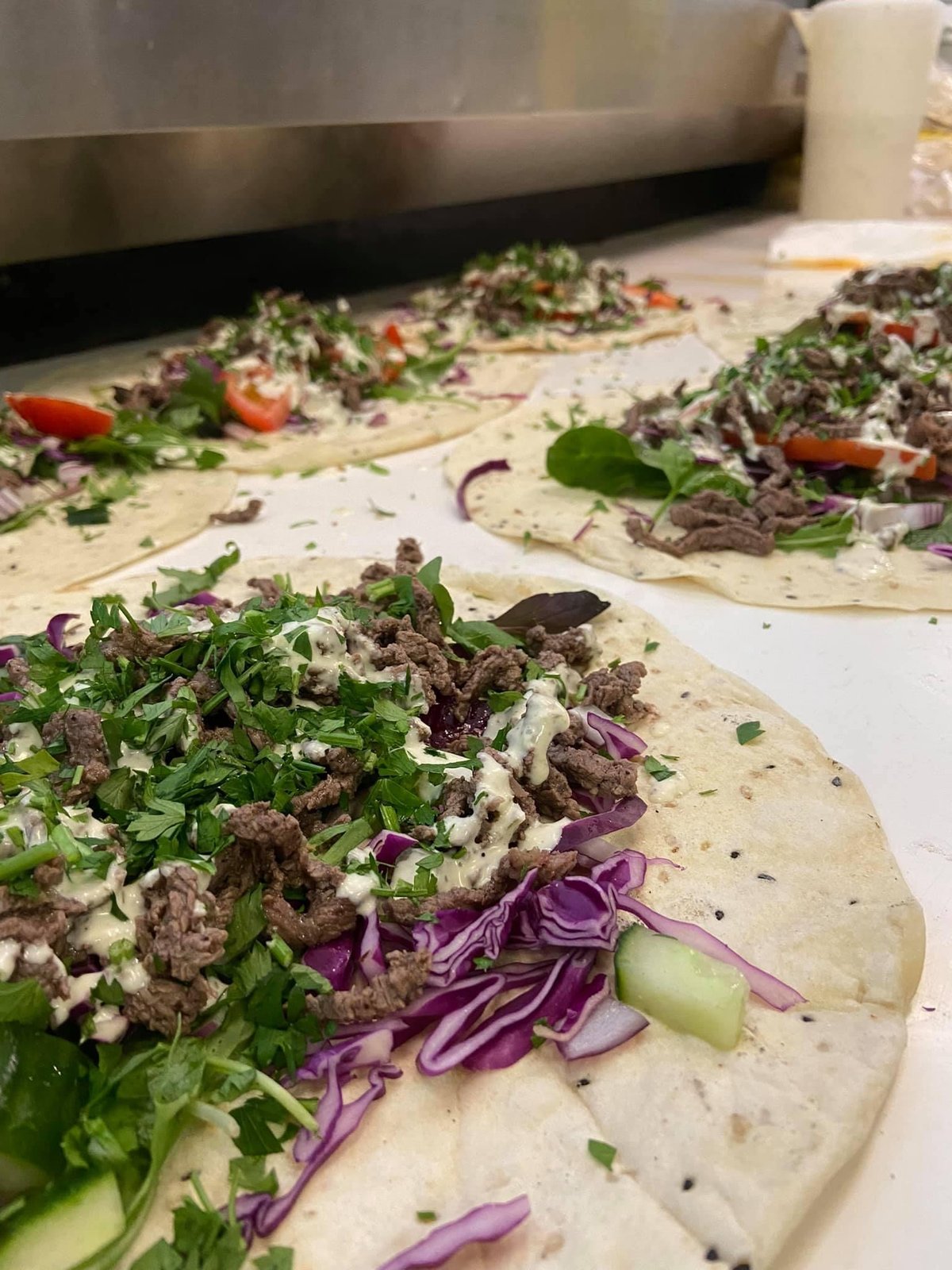 Fladbrød med rødkål, agurk, tomat, grøn salat, feta og valgfri dressing. Serveres med valgfrit tilbehør og valgfri drikkevare. Vælg selv menustørrelse.