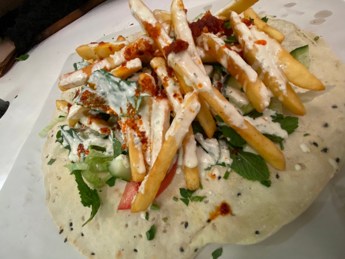 Falafler, blandet salat, hummus, tahini, brød og pommes frites.