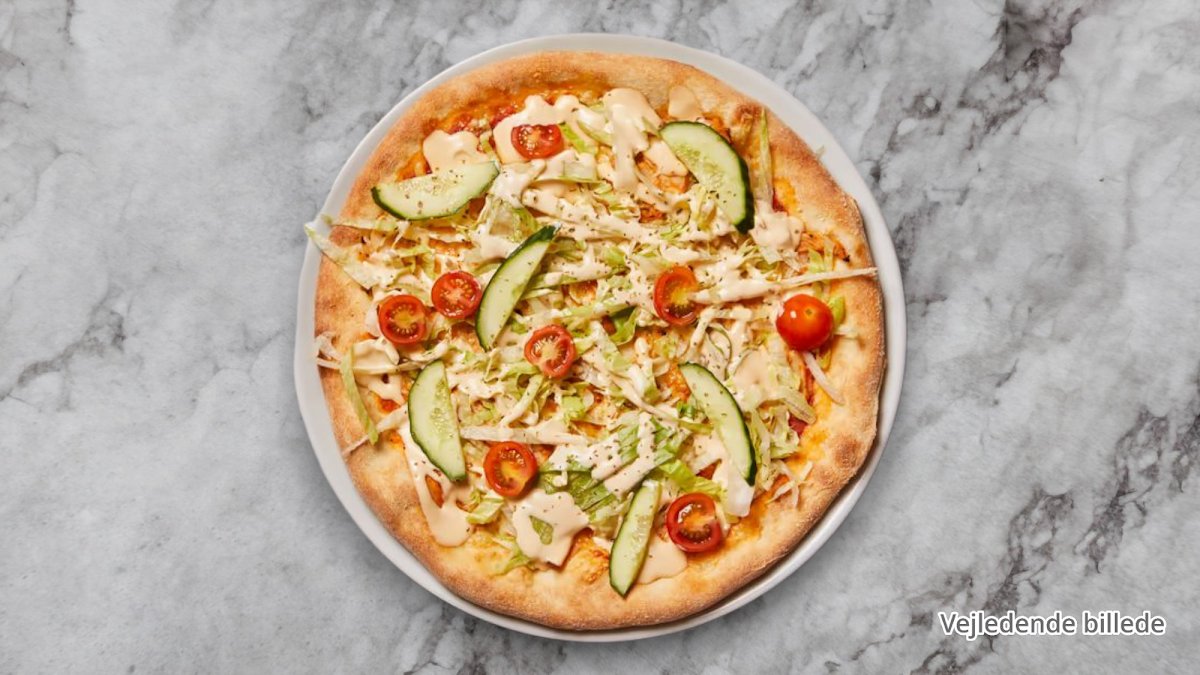 Tomatsauce, ost, pepperoni, kebab, salat og hjemmelavet dressing.