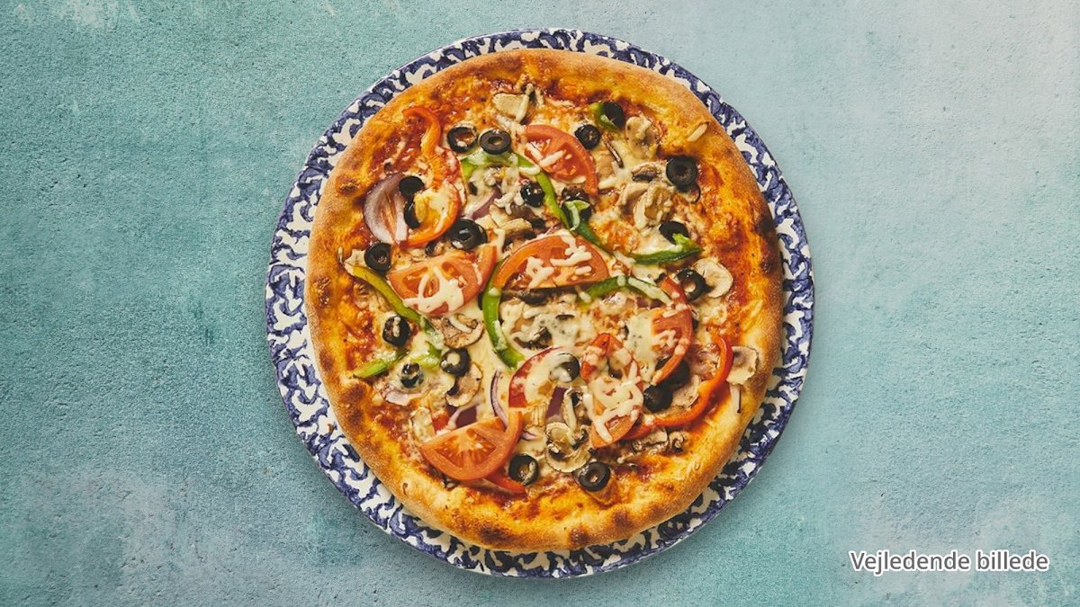 Tomatsauce, ost, kartofler, tomatskiver, løg, peberfrugt, oliven og champignon.