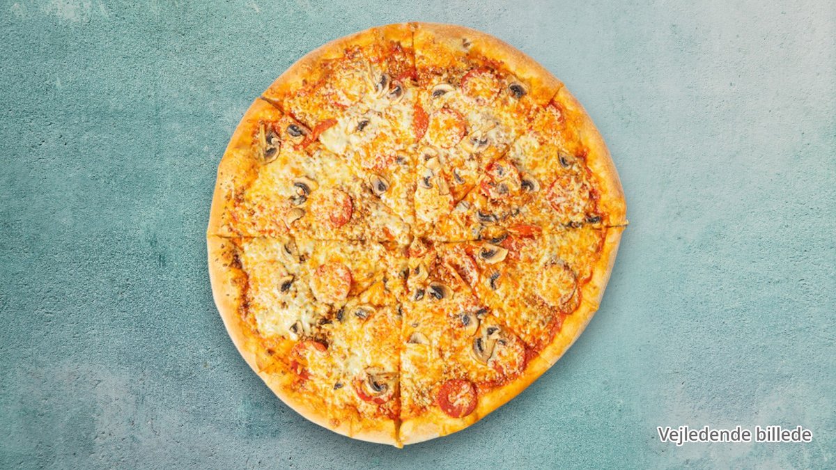 Tomatsauce, ost, oksekød, løg, pepperoni og champignon