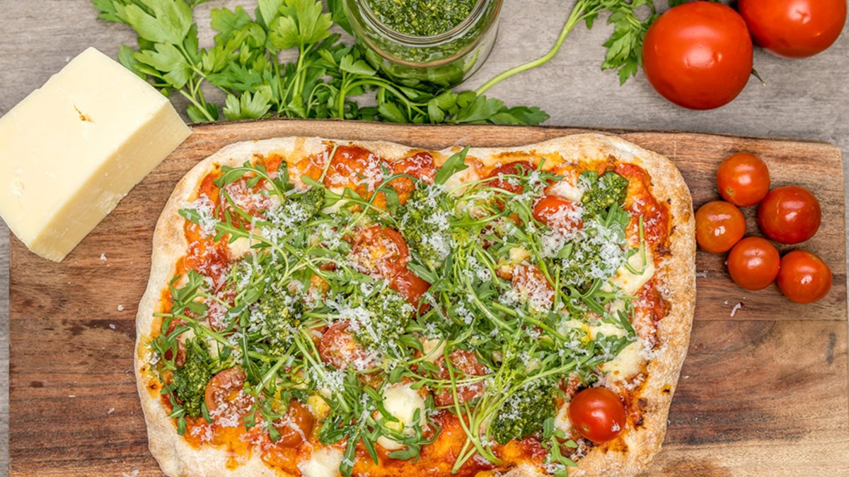 Pinsa, Tomatsovs, Cherrytomat, Mozzarella, Rucola, Parmesan, Pesto