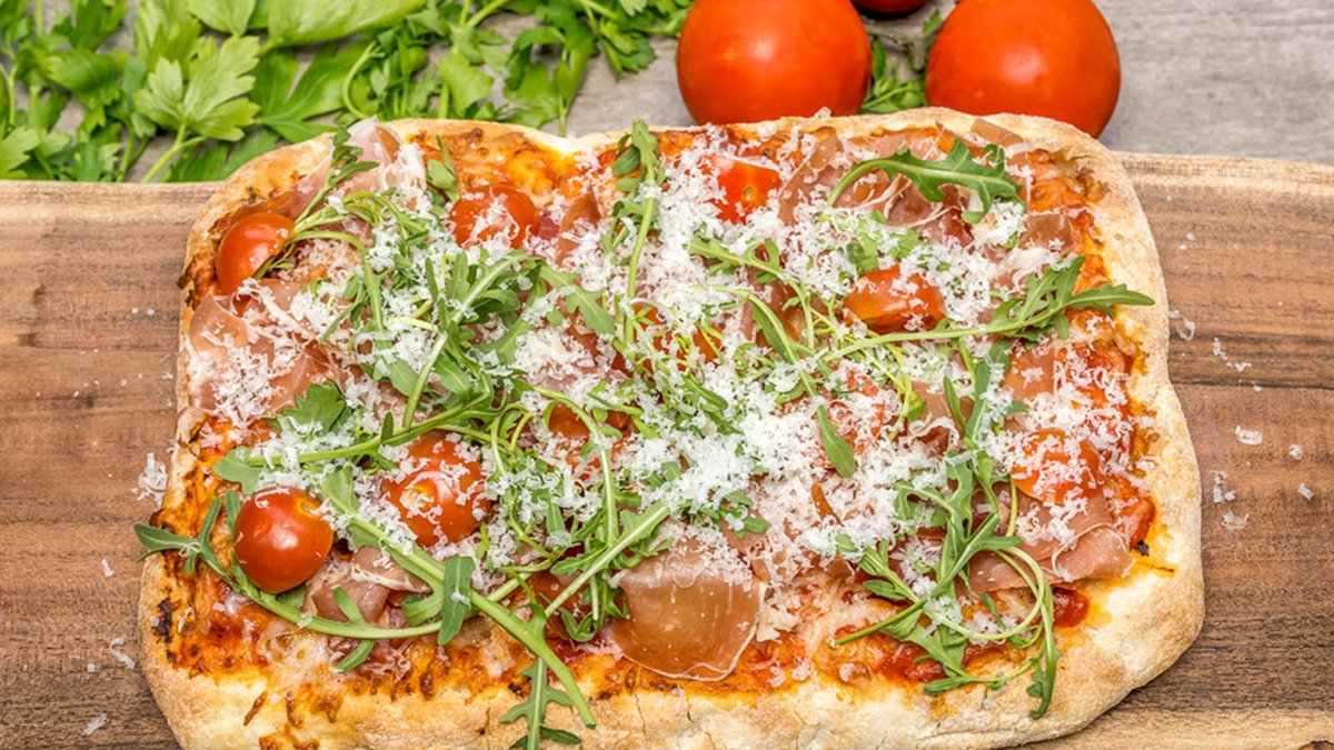 Pinsa, Tomatsovs, Mozzarella, Serrano skinke, Ruccola, Cherrytomat, Parmesan