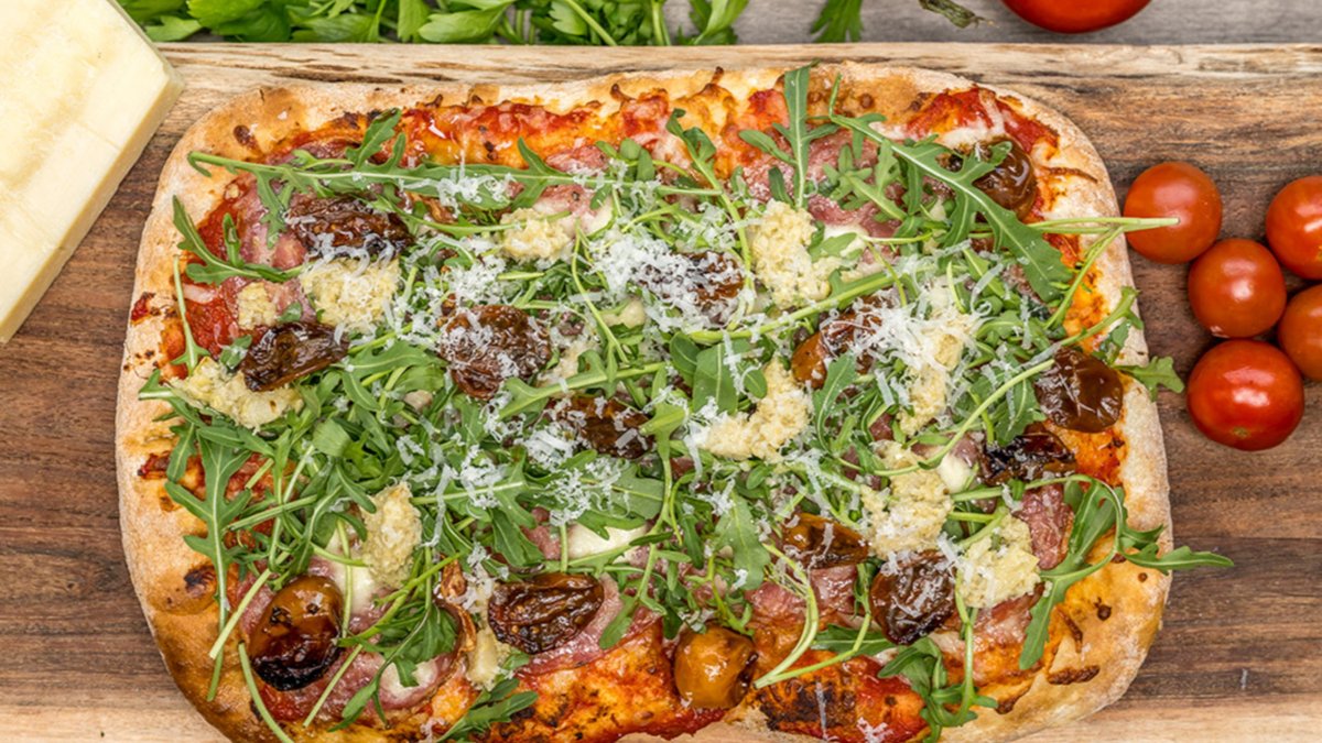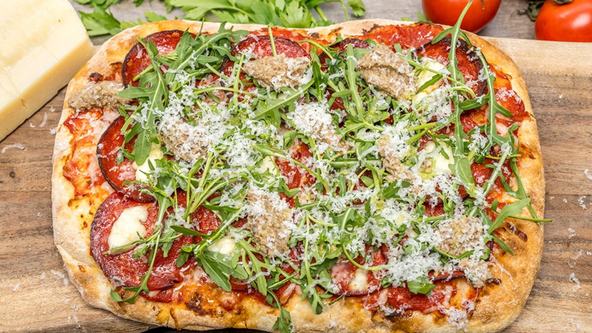 Pinsa, Tomatsovs, Fennikel Salami, Semidried Tomat, Mozzarella, Artiskok Creme, Rucola, Parmesan