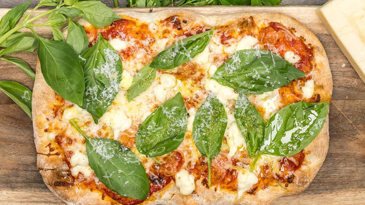 Pinsa, Tomatsovs, Mozzarella, Parmesan, Basilikum