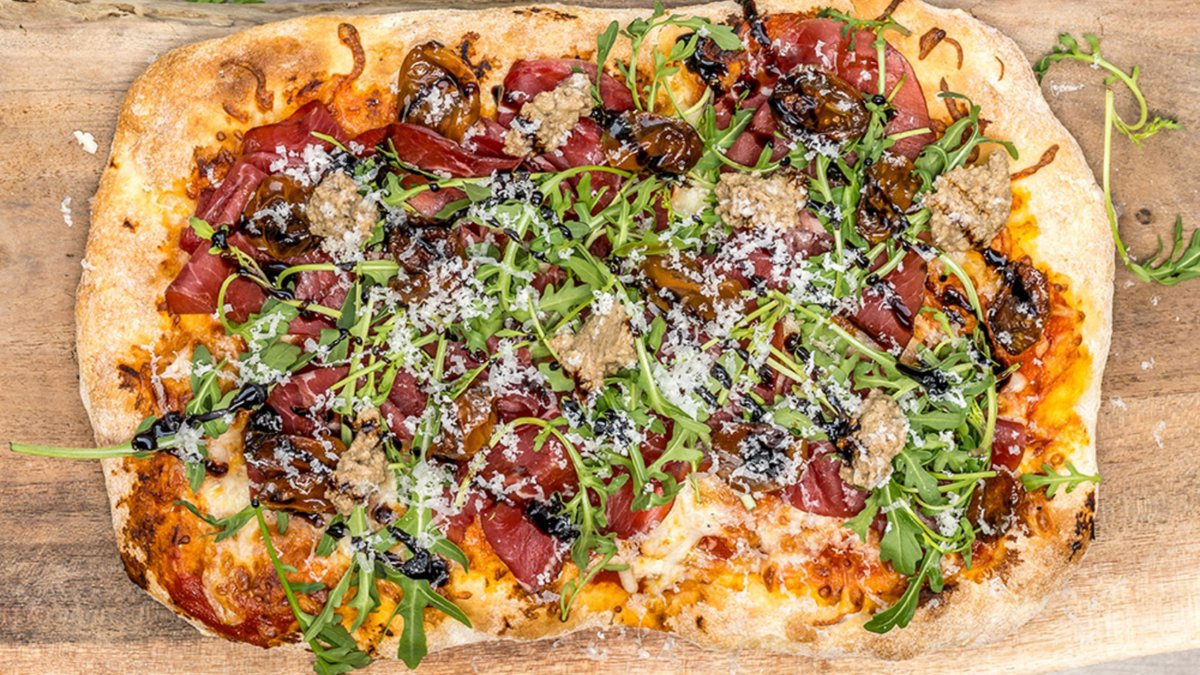 Pinsa, Tomatsovs, Bresaola, Mozzarella, Semidried Tomater, Rucola, Svampecreme, Balsamico