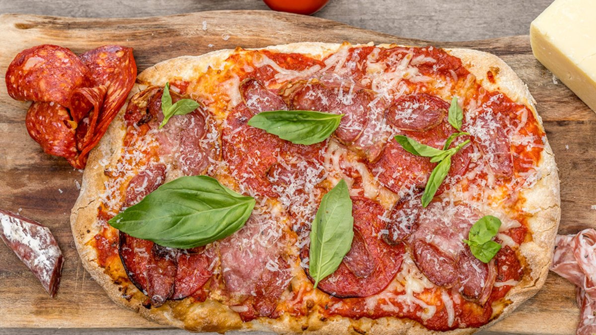 Pinsa, Tomatsovs, Serrano, Chorizo, Fuet, Mozzarella, Basilikum, Parmesan