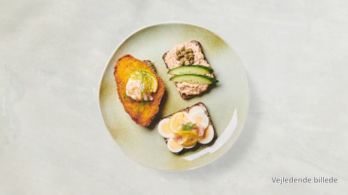 Rugbrød med smør toppet med fiskefrikadeller, remoulade, citron og dild.