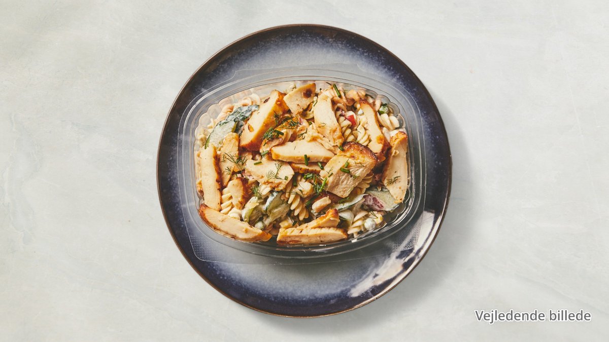 Pasta, bacon, kylling, æg, salat, mayonnaise og dressing.