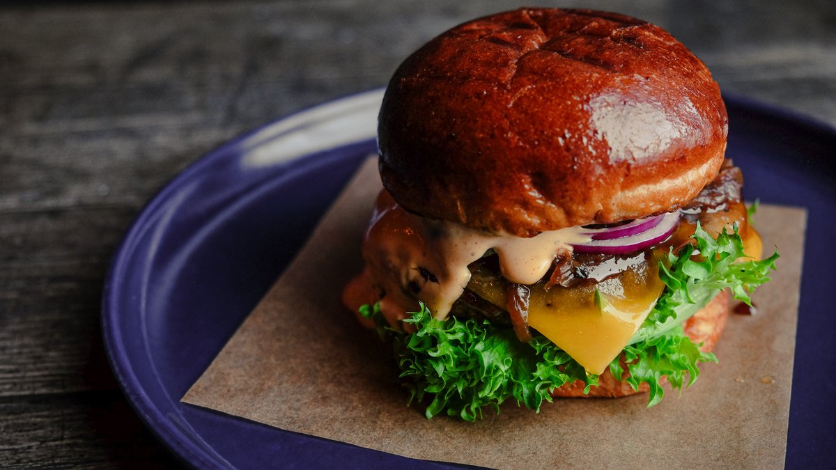 Krogmodnet okse, chillimayo, cheddar, dill pickles, rødløg & kartoffel brioche. Hertil pommes frites & ketchup