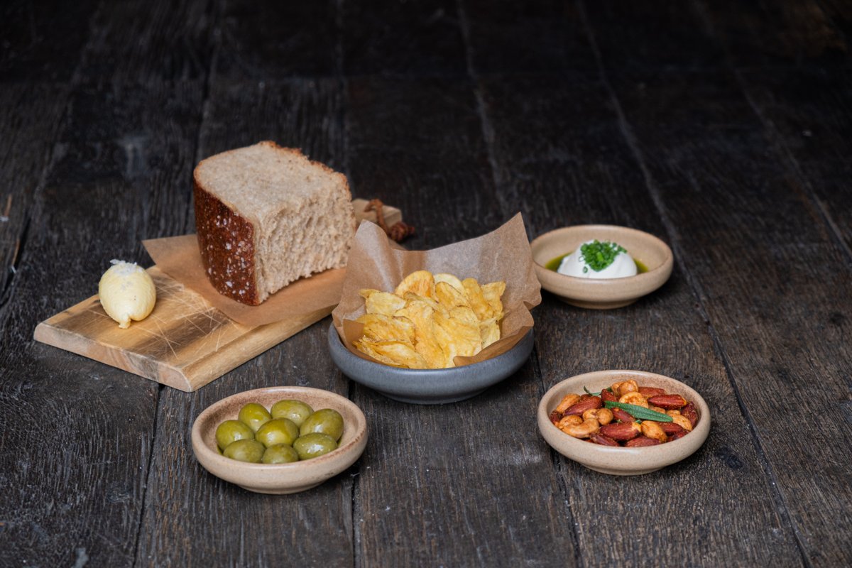 Romesco, nødder, oliven og manitoba brød med rørt smør.