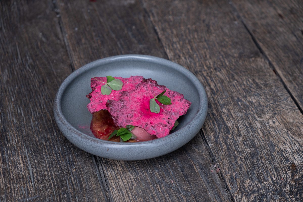 Velfærdsgris med confiteret svinebov, jordskokker, vinterkål, tyttebær & trøffelsauce . Hertil kommer kartoffel kompot til to